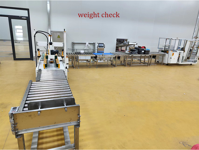 ჩანთების გაყინული საკვებით შევსების შემდეგ, თითოეული ტომარა ხელახლა შემოწმდება წონის დეტექტორით, რათა დარწმუნდეს, რომ წონა ემთხვევა სამიზნე წონას, შემდეგ კი გადის ლითონის დეტექტორში, რათა დარწმუნდეს, რომ თითოეულ ტომარაში მეტალი არ არის შერეული. შემდეგ ჩანთები ტრანსპორტირდება მუყაოს შევსების ხაზში.