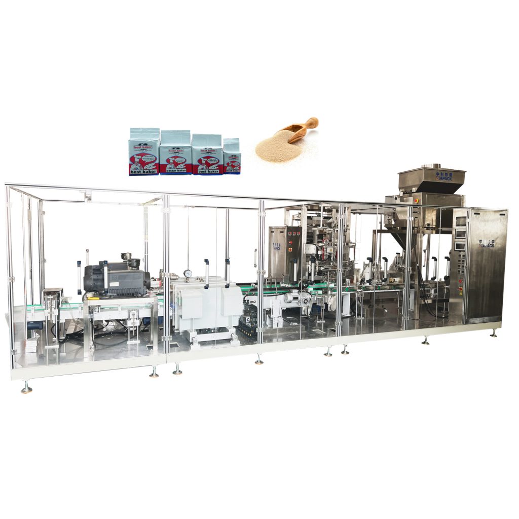 ეს მანქანა მოიცავს ერთი კომპლექტი ZK3 ვაკუუმ ლიფტი მშრალი საფუარის კვებისათვის, ერთი კომპლექტი ZL520 ვერტიკალური ჩანთების შესაფუთი და დალუქვის მანქანა. ერთი კომპლექტი ZLC4-2000 ოთხი ვედრო ამწონი მანქანა, ერთი კომპლექტი ZL-100V2 ორმაგი ვაკუუმ კამერის შესაფუთი მანქანა. ეს მანქანა ფართოდ გამოიყენება კვების სააფთიაქო ქიმიკატების და სხვა პროდუქტის ფხვნილის ან მცირე გრანულების შესაფუთად. ისევე როგორც ყავის ფხვნილი, საფუარი ფხვნილი ხორბლის ფქვილი და ასე შემდეგ. მთელი მანქანა იღებს შიგნით სატუმბი პროდუქტის ვაკუუმს. ვაკუუმის ხარისხი ძალიან მაღალია და შეფუთვის სიჩქარე ძალიან მაღალია შეიძლება მიაღწიოს 30 ჩანთა / წთ .მზა პროდუქტს აქვს ხანგრძლივი შენახვის ვადა და ლამაზი ფორმა .